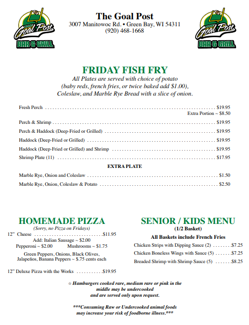 Welcome to The Goal Post Bar & Grill, located in the heart of Green Bay at 3007 Manitowoc Rd. This inviting establishment is a local favorite, renowned for its Friday Fish Fry, featuring an array of options like fresh perch, haddock, and shrimp, all expertly prepared at just $19.95. The portions are generous and the flavors are bold, making it a must-try for seafood lovers.
